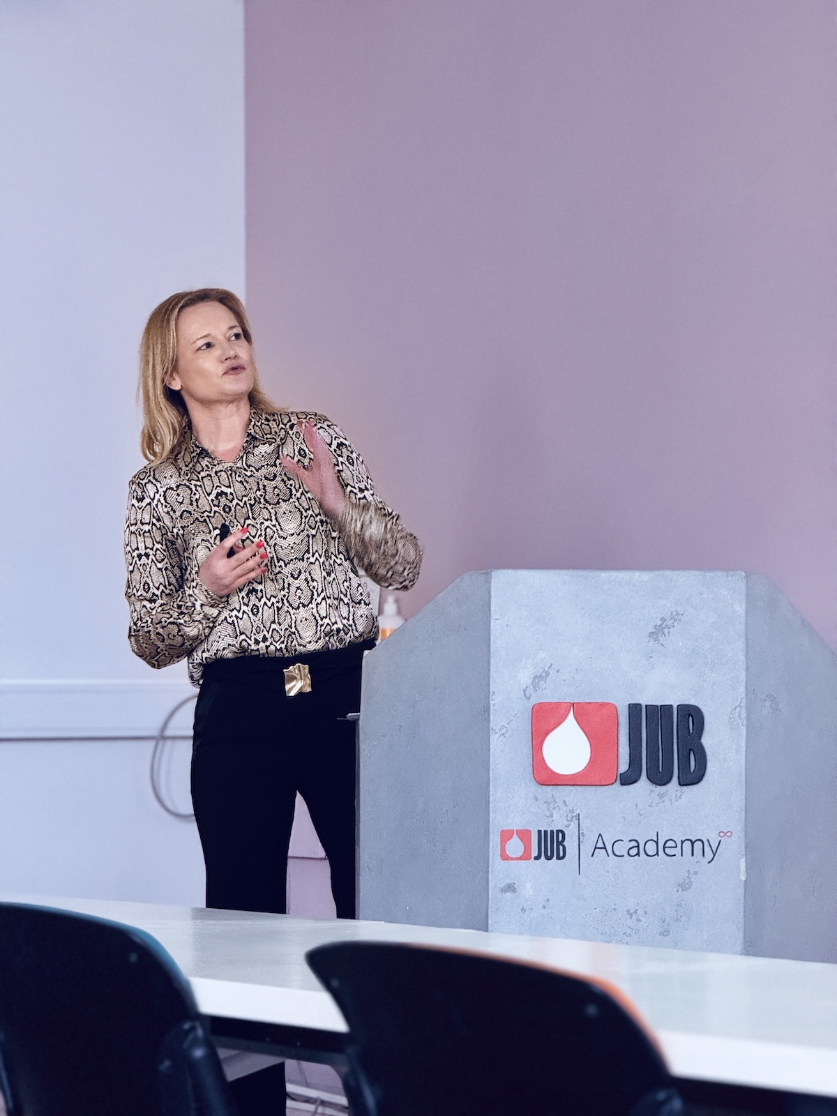 Poseben vpogled v razvoj izdelkov je ponudil vodja niansiranja Janez Tušek, ki je predstavil nastajanje nove barvne karte JUB. Podjetje ima na trgu približno 1500 mešalnic barv. Večina je povezana v centralni sistem, kar omogoča dragocen vpogled v preference kupcev. Med razvojem nove barvne karte so se tako naslonili na podatke iz prakse, pa tudi na povratne informacije trgovcev in izvajalcev, ki so poudarili potrebo po čim bolj enostavnih in razumljivih informacijah na karti.